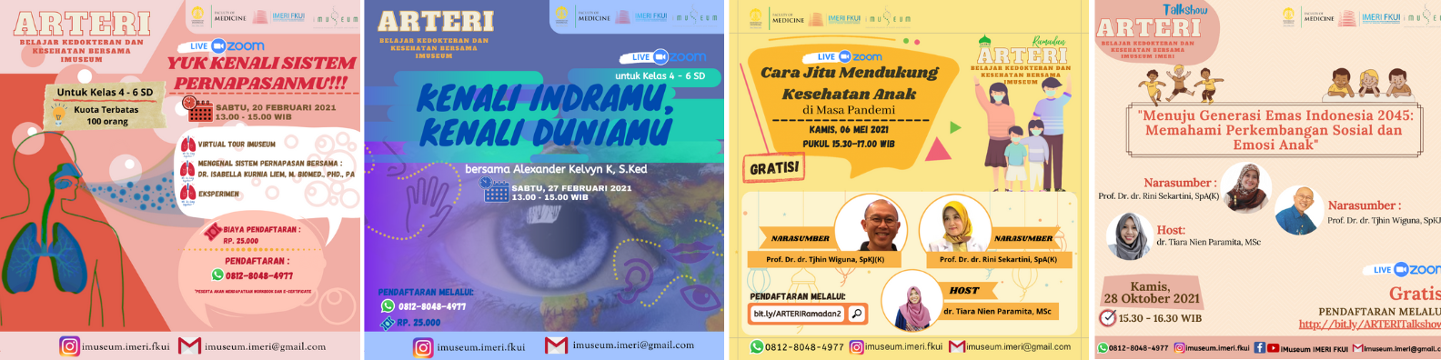 Arteri (Belajar Kedokteran dan Kesehatan Bersama iMuseum IMERI FKUI) is a public program that is given to general public, especially children, about medical and health information. The "Arteri" is implemented virtual because pandemic situation. There are many themes that are presented in this event such as digestive system, respiratory system, etc. Public program "Arteri"is very interisting because beside the presentation from speaker, there are experiment that add knowledge. |